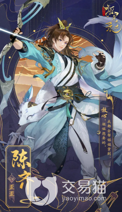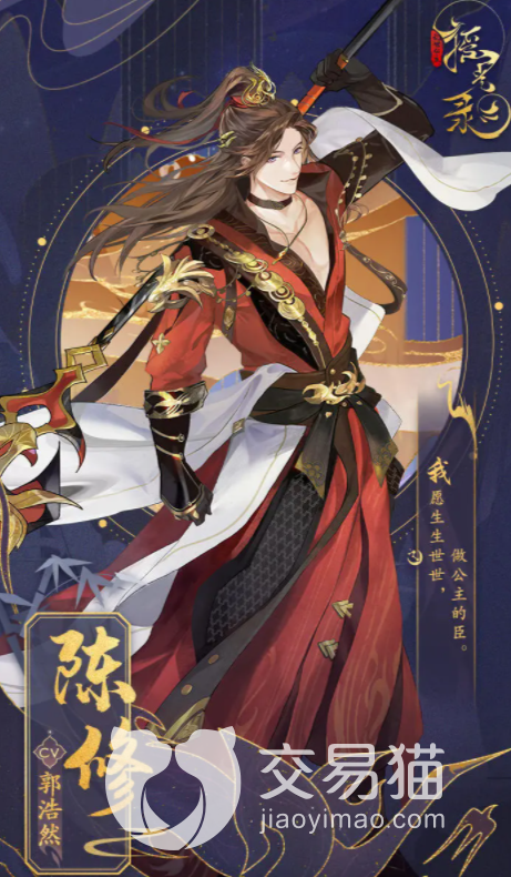 陈修,棕发红衣的深情狼狗。陈修这个角色最大的特色就在于忠诚和深情,他是陈家枪的继承人,性格霸道张扬但是对待外人却非常有礼貌,在东禹国的地位比较高,没接过家业之前就是一个小霸王。接过家族重担后好像立马就长大了,开启东虞之后的灿烂和辉煌。