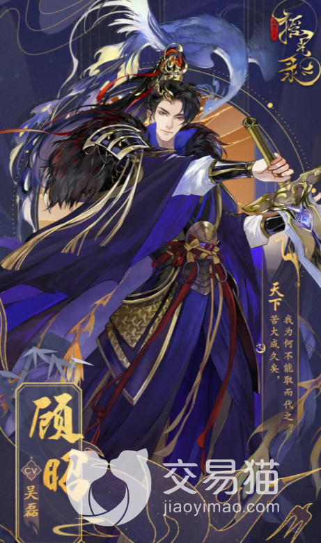 顾昭,墨发蓝衣的顾昭,在游戏当中的身份是大成极具威望的大将军,不爱上朝是因为不喜欢和朝中党派进行争斗,打仗的能力一流。大成国君对他又爱又怕,顾昭这人最大的愿望就是希望天下安定,百姓安居乐业。