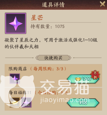 而天相想要升级,需要两种材料,第一种材料是星芒,用来激活或者强化角色10级以内的天相,获取方式有三种,第一种是限购商店,每周能够购买3次,1200元宝能够买100个,算是比较稀有的。