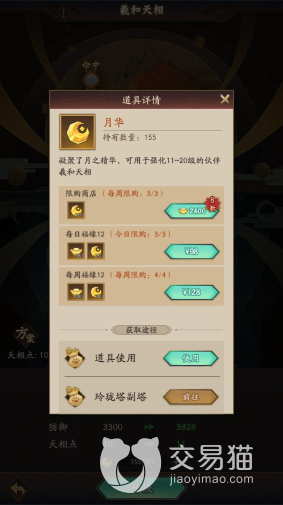 10级之后的天相升级则需要用到月华和日精,这个材料的获取方式和星芒是一样的,也是可以使用元宝购买,或者是挑战玲珑塔的副塔,不过获得的数量会比较少,所以想要升级星佑还是非常困难的。
