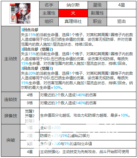 先来说说纳尔斯的作用吧,许多小伙伴只是有纳尔斯这个角色,还不知道他的作用都有什么,可以打什么位置。纳尔斯可以给对手施加流血效果,有纳尔斯的小伙伴们,要想叠加多层流血需要小伙伴们控制角色的血量,在使用主动技能的时候保持一个比较低的水平。