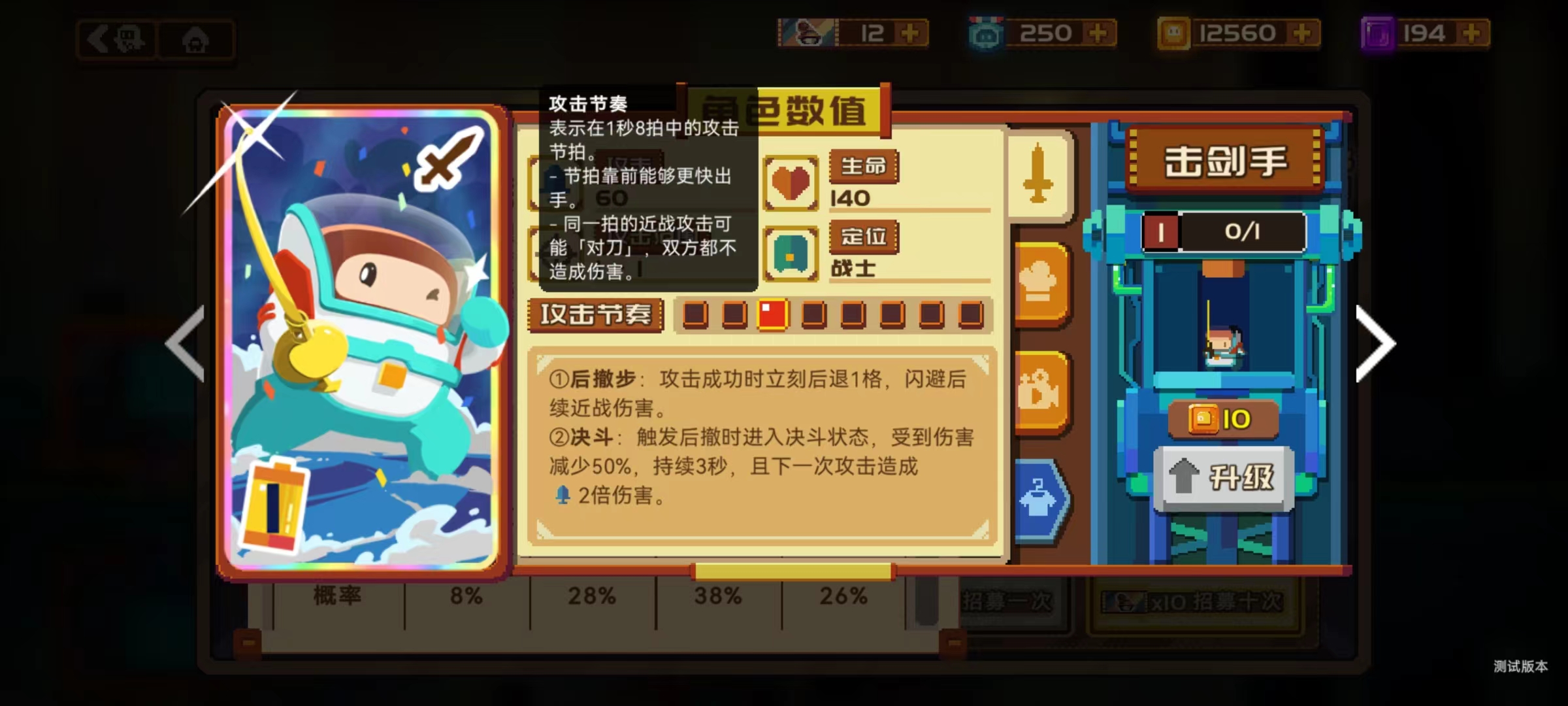 游戏中将一秒钟分为8个不同节拍,对应的就是每个角色上面的8个不同小方块当前红色跳动的点,就是所处节奏。如果节拍靠前就能更快出手,同样道理靠后就会晚出手,出手顺序非常关键,在双方攻击力都比较接近情况下,率先出手一方肯定会有优势,但游戏并不是单纯意义上的单挑,还要考虑到其他很多方面。如果是近战角色,双方处于同一节拍,就会出现对刀情况,一旦触发对刀双方都不会造成伤害,但也有例外存在。