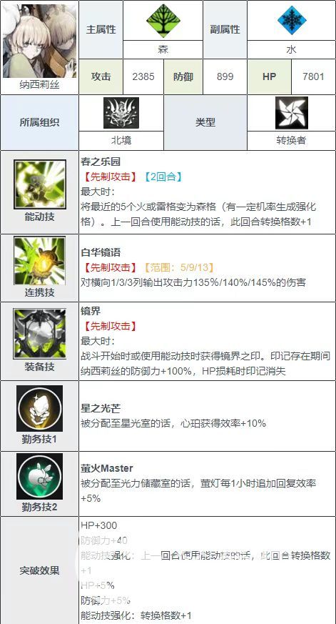 以上就是小编分享的有关白夜极光纳西莉丝阵容搭配推荐,虽然整个森属性的阵容搭配攻击力高,也有尤莱雅这个奶妈给队伍的角色进行血量的恢复,但是这个阵容只在游戏的前期十分厉害,后期就会渐渐变得力不从心,十分拉胯。但是在游戏中对付前期足够了,毕竟强势的角色白夜极光的小伙伴们一下子也抽不齐,后续需要小伙伴们更换星级更高更厉害的角色来代替。