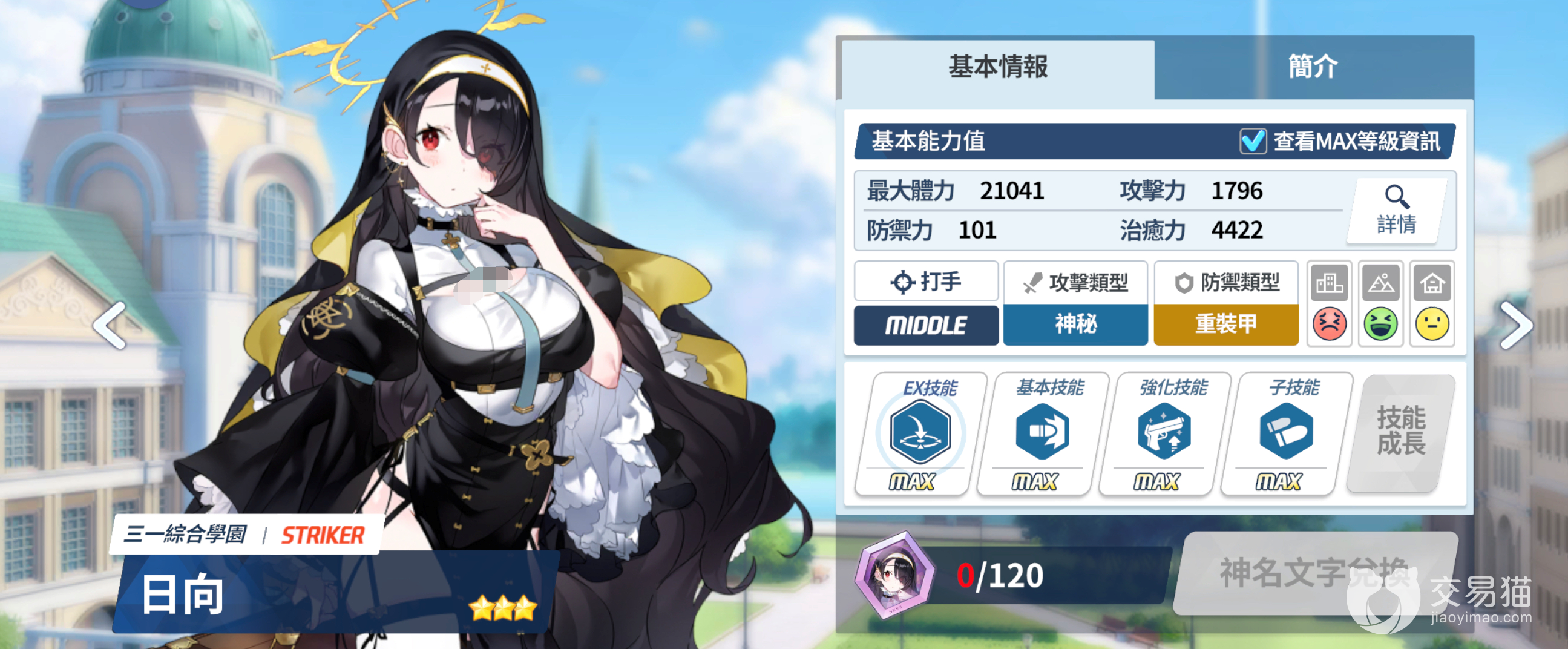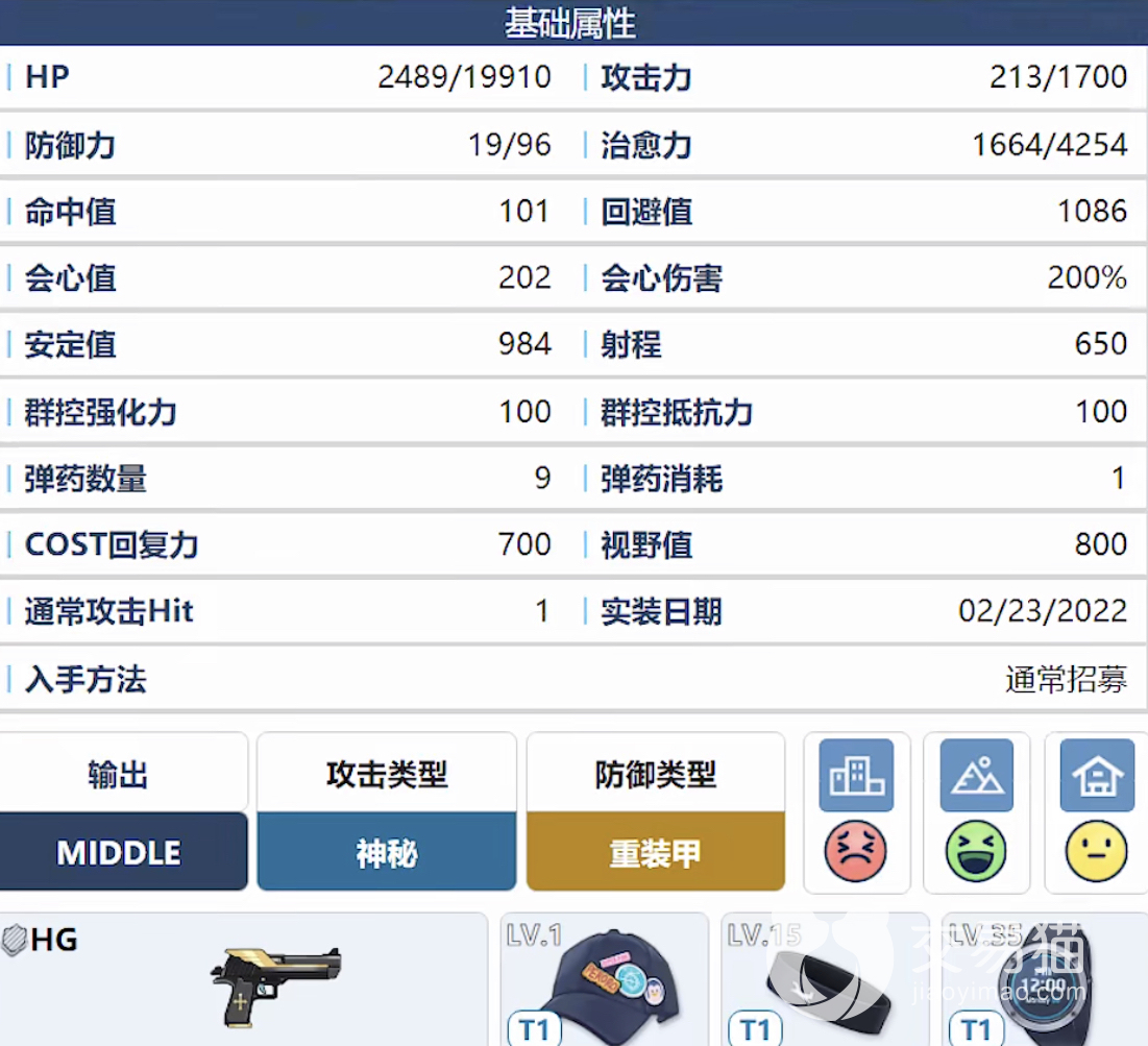 从若叶日向的个人主页信息中能够看出,她属于神秘属性AOE前排输出角色,使用的武器是一把手枪,所以她的基础攻击力与命中率数值都是偏低的,但暴击伤害和暴击数值属于正常范畴。一般为她选择装备散件时,建议玩家们选择攻击属性的帽子、血量加成或防御力加成的防具以及增加暴击伤害的手表。