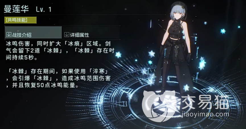 其次就是散华的共鸣技能:曼莲华,这也是冰属性的伤害,角色在释放技能之后会产生剑气,剑气之下会留有2道存在5秒的冰棘,并且冰棘存在期间,大家如果使用淬寒技能,还可以造成范围性的冰属性伤害,并且回复50点能量,这一个技能可以作为大招的充能技能,在大招充能未满的情况下可以多多使用此技能。