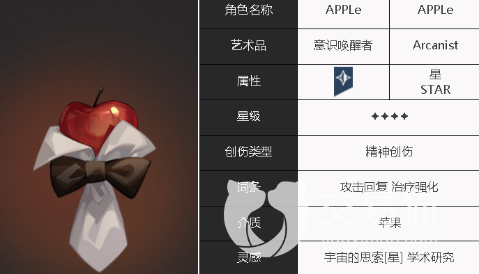 苹果:苹果在游戏内是一个拥有多项输出方式的恢复型英雄,他的品级只有四星,但是实力却一点都不差,属于艺术的唤醒者,拥有攻击回复,治疗,强化的能力,他在攻击的时候可以帮助自身恢复一定的生命值。而且在进行单体攻击的时候,不但能造成精神创伤,同时也能为生命值最低的我方单位恢复一定的攻击生命能量,玩家们可以给角色不断的恢复生命,只要我们的攻击实力足够强势,那么完全可以快速的一口回满血。