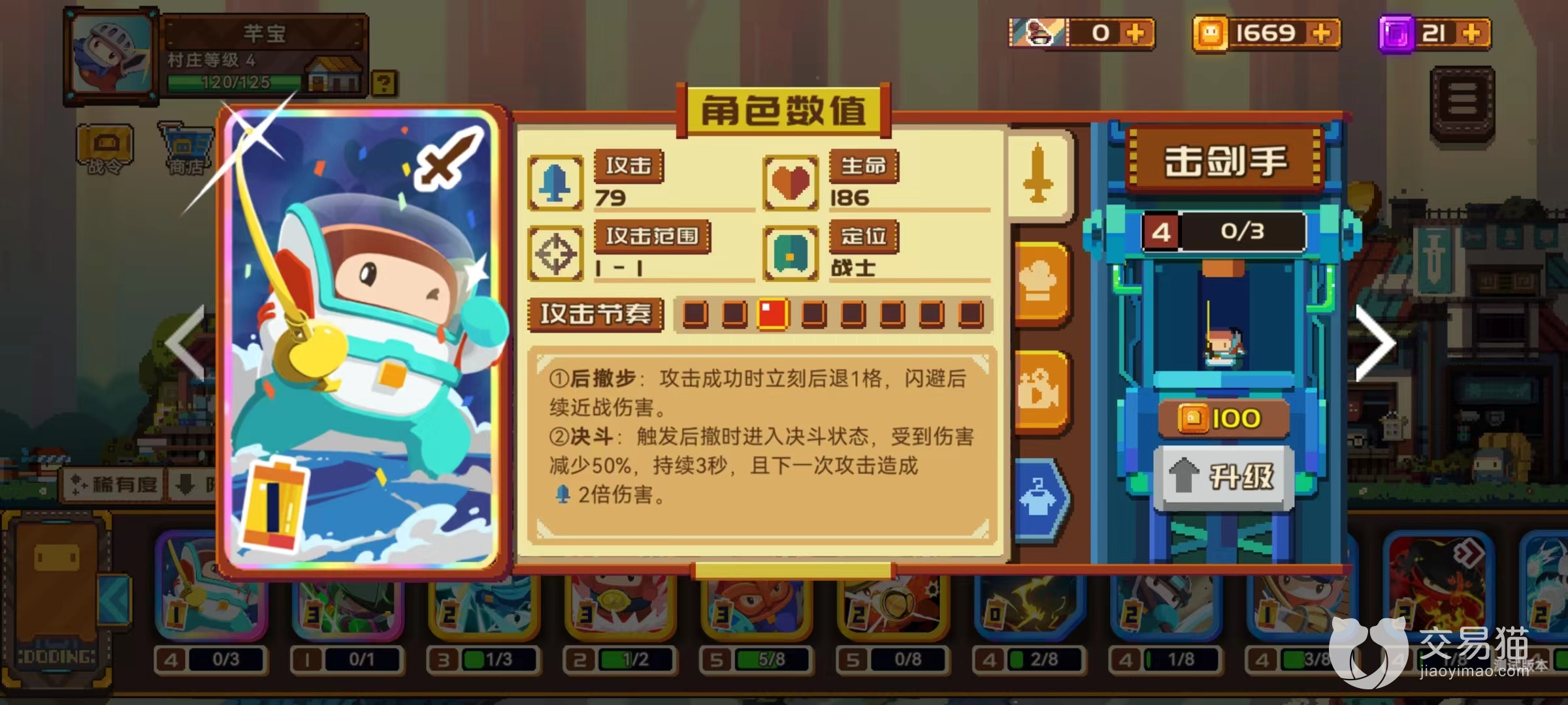 击剑手是一个非常灵活的角色,游戏定位是战士,攻击敌人成功时立刻后退1格,闪避后续近战伤害,触发后撤时进入决斗状态,受到的伤害减少50%,持续3秒,且下一次攻击造成2倍伤害。