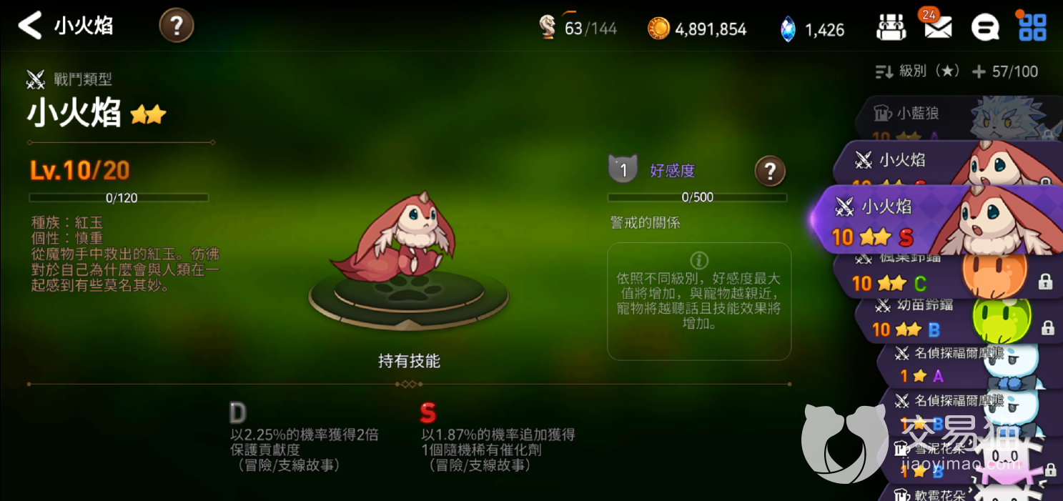2、胚子二:第三个宠物要带有C技能,升2星的时候要保留C才能。在练到满级后和随意的3星继续合成,并保留C技能。之后再给练到满级和随便一个4星宠物进行合成,并保留C技能。这个玩家所需要第二个C技能的胚子也算是做好了。