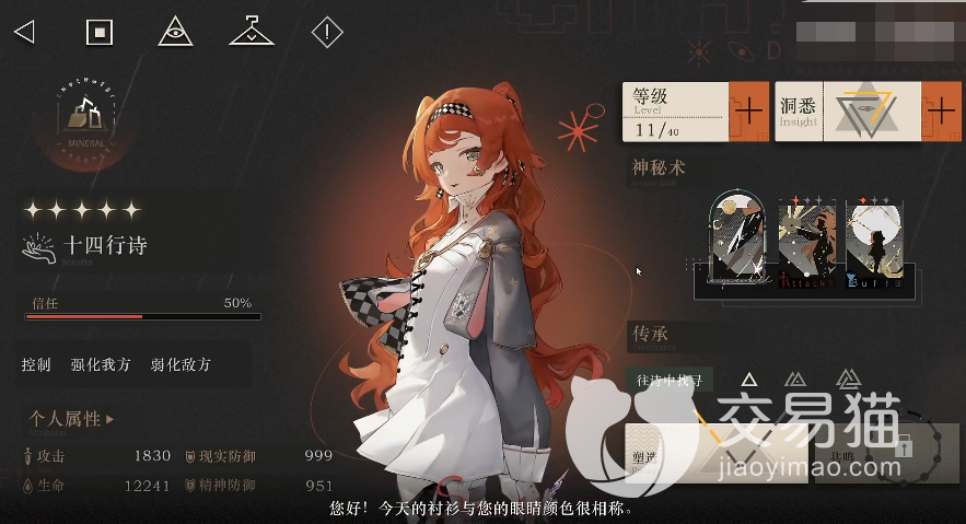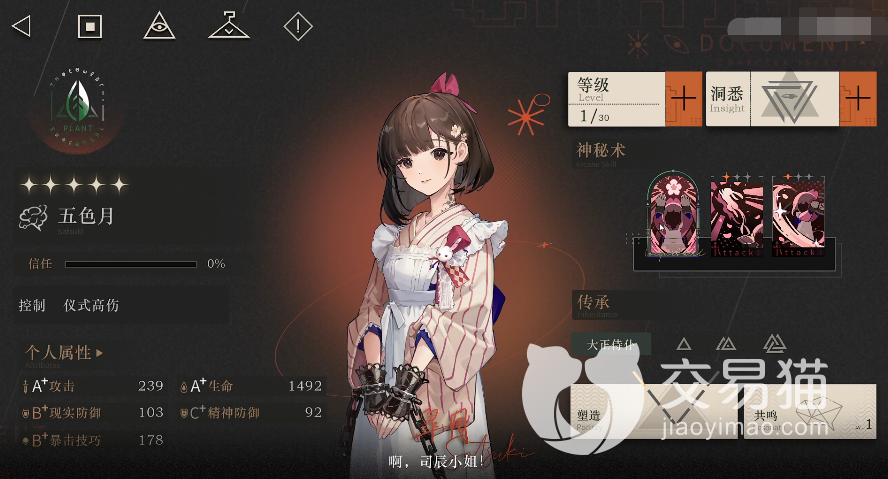 ②夏利:攻击极高的一个精神创伤角色,她的所有技能都能打伤害,而且倍率也不低,因此实战过程中无论是单体输出还是群体输出都十分给力,不过由于其面板的双抗略低,所以在洞悉之前可能会出现暴毙的情况,不过只要完成洞悉,她就能够在半血以下获得免伤从而让自己能够站稳脚跟,后续再经过一轮技能的轰炸,敌人很快就会烟消云散。此外,她的大招本身还能清除敌人身上的增益和反制,因此功能性这块也是具备的。