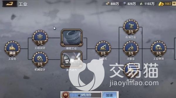 工业科技则与基地的发展有关,其所带来的加比较杂。其中,第一行的唯一科技工业化必须点满,第二行工程试验和机械设计则无需升满,但至少都要加一点,确保点出橡胶工业和蒸汽动力,往后的科技树则也是按需升级,也可根据后续的工业科技点亮条件来进行研发,必要时可进行加速。