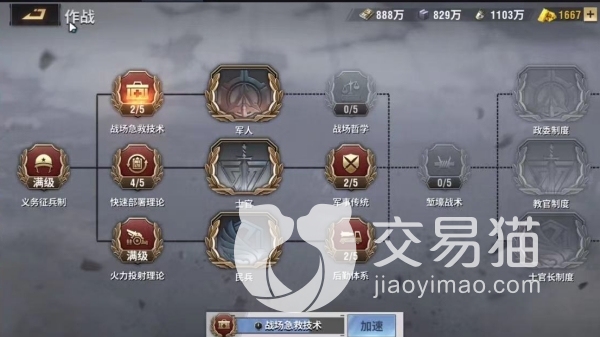 玩家在战火勋章中最需要升级的科技主要有两种,一是工业,二是作战。其中,作战主要加成对象为兵种卡,是提升兵种实力的重要途径,因而其优先度要高于工业。玩家在升级时,第一行征兵要先升满,第二行只用将火力理论升满(加战力),急救和部署视需要升级,后面同理,优先确保点满对战力加成的科技后再考虑其它。