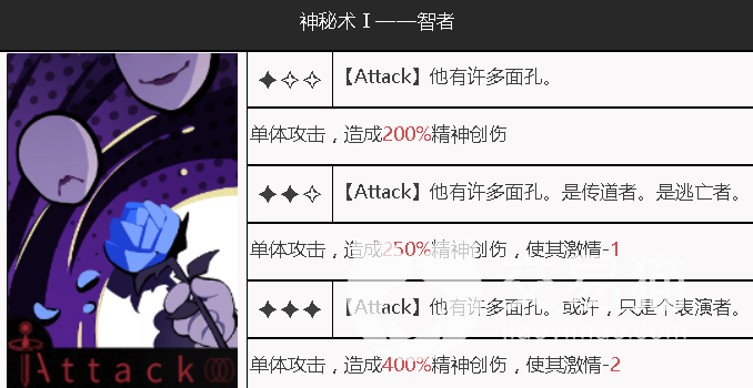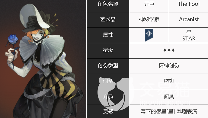 弄臣在游戏内的星级为三星,属于一个精神创伤类的角色,他的属性为防御,在战斗的时候可以为队友提供一定的保护作用。他拥有千万张面孔,单体攻击的时候可以使敌方的激情不断的下降。