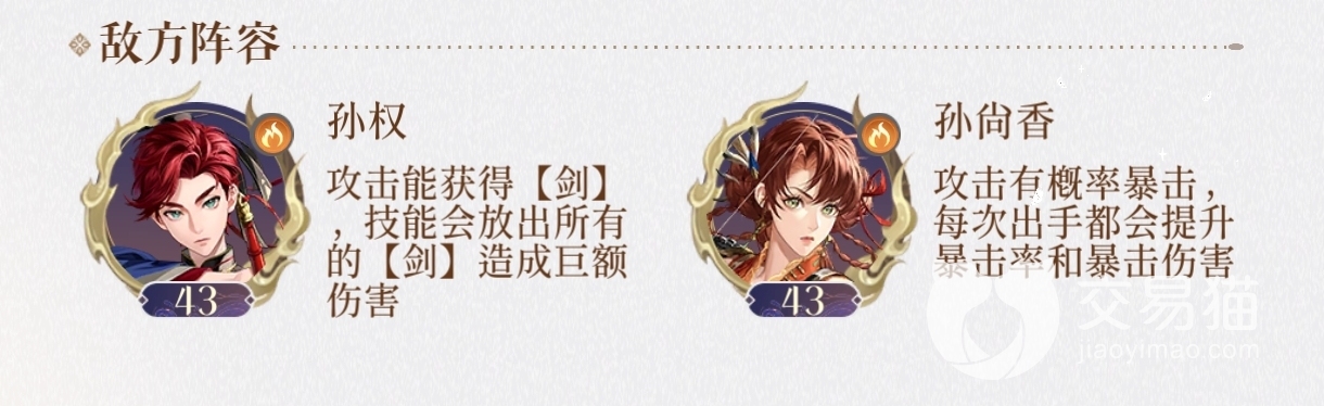 以上就是通关的基本思路主要就是需要在孙权开大之前迅速秒掉孙权,在孙尚香获得足够回合的暴击之前击败孙尚香,在这个队伍中一定要携带的就是盾系角色,由于孙尚香是一个单体攻击角色,使用盾系角色可以极大的缓解全对输出角色的压力。