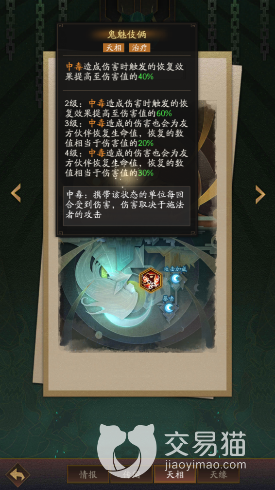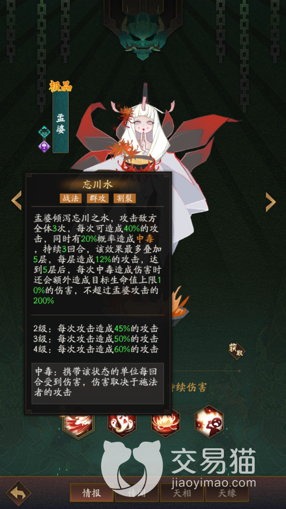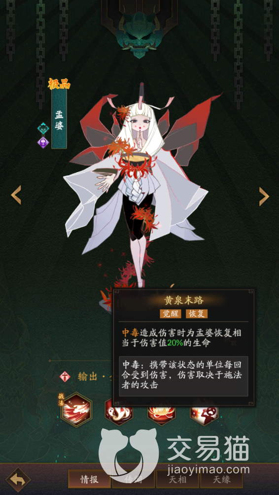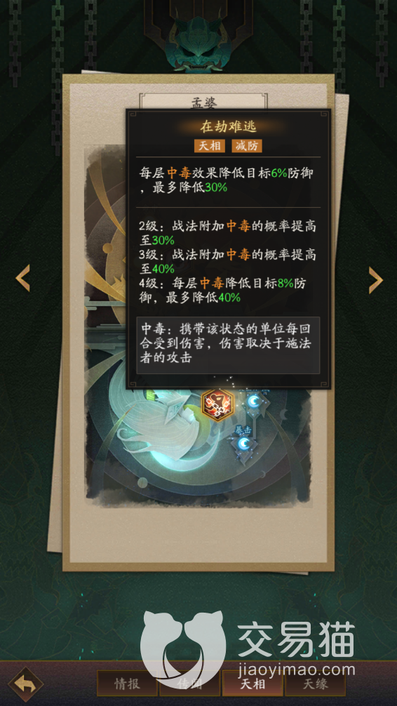 首先孟婆作为鬼族的一员,其核心定位是群体输出和持续伤害,天相也有两种,第一种名为鬼魅伎俩,效果是触发中毒的debuff时,带来的恢复效果能够提高一定的比例,在这个天相升级到4级的时候,还能够后为友方回复生命值,同时加点提升的时自身的命中和破防。