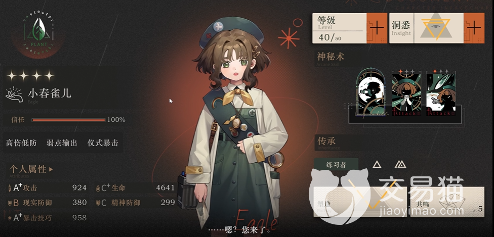 因为角色之间的限制,可以搭配起来的队伍就是小春雀儿+泥鯭的士+五色月+吵闹鬼以及apple这几个角色,要是大家想在游戏中使用跟星锑角色有关的队伍,这个队伍是目前最合适的,小春雀这个角色是游戏中典型的输出角色,她可以在游戏中根据敌人的弱点来打击,而且本身自带的暴击率是比较高的,虽然是一个四星角色,但是攻击上面是可以用的。