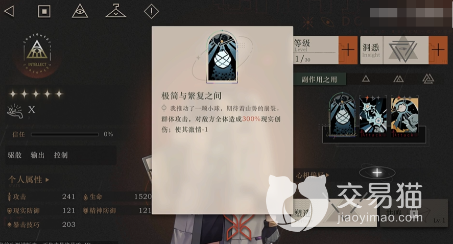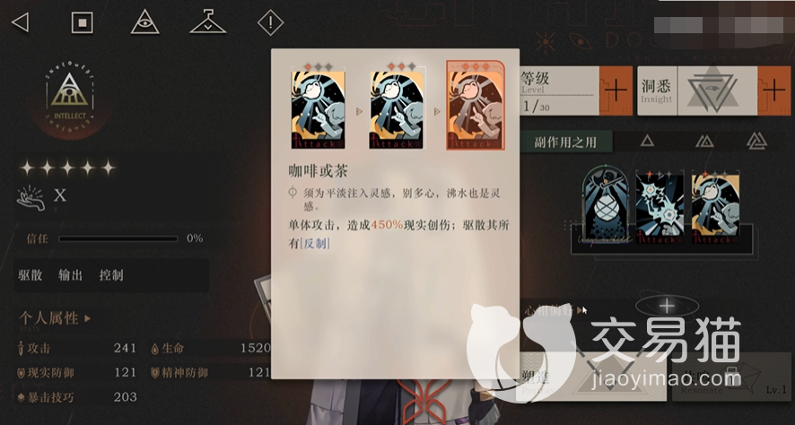 技能这块,他的三个技能都是具备输出能力的,这就意味着他在实战过程中伤害非常出色,不过除了大招之外其两个小技能都是单体伤害,而且伤害的数值都是450%的攻击力,这个数值本身并不算低,因为它不仅倍率出色,而且应用在X的高额攻击力属性上发挥也更加亮眼。并且两个小技能还都有一定的驱散作用,但这个驱散需要等到技能星级被融合至二星和三星时才能发挥出来,其中“咖啡与茶”驱散的是敌人的反制状态,这就让己方C位在输出时,不再因为忌惮这个状态不敢下手。