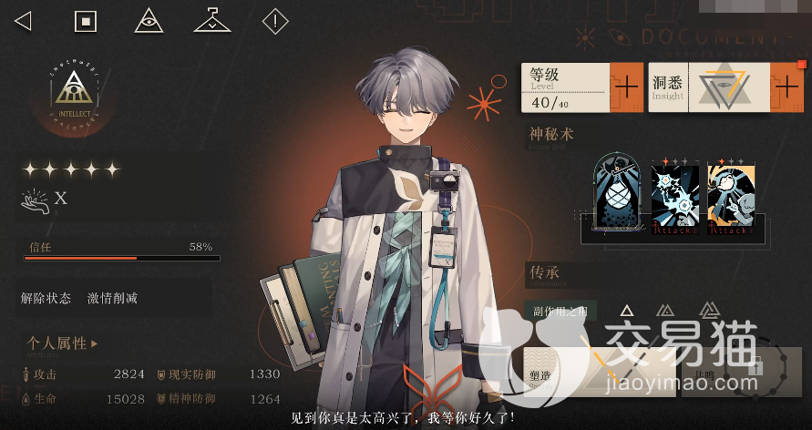 接着来看属性和技能,从其初始形象的面板中可以发现他的属性其实是比较均衡的,在攻击力较为优秀的同时双抗与生命值的数值也不低,这让他在前面的一些关卡中表现的十分全能,也正因此,他和很多的队伍都比较契合,对队友配置没有什么要求,属于一个即插即用的角色。