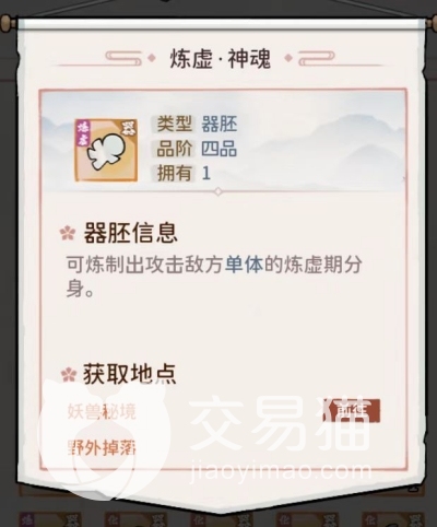 神魂器胚是一种炼器材料,在游戏中仅有炼制成法宝这一个作用。玩家可以在炼器阁中安排一位炼器天赋高的弟子,在点击相对应的法宝炼制选项后,花费一定的灵石和其它材料炼制出神魂法宝,法宝境界与神魂器胚原本的境界相对应。