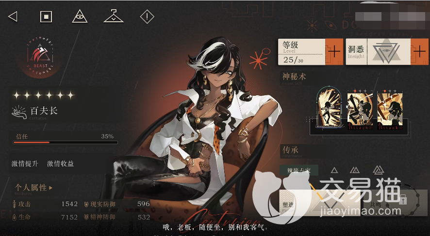 ①百夫长:这是六星中为数不多的纯输出角色,她的核心亮点是能够根据自身的激情层数来增加伤害,增加的形式有两种,第一种是洞悉一次后解锁的“每点激情+5攻击力”效果,第二种则是一技能所提供的20%~50%激情附伤,这个附伤的算法是激情层数乘以20%/30%/50%,技能星级越高,则后续的乘以的系数就越大,另外她的二技能到二星以上后本身也是可以添加激情的,所以也无需刻意搭配一个辅助来配合她,而且她本身也不算脆,通过大招还能降低敌人的仪式伤害,从而令自身变得更加能抗。