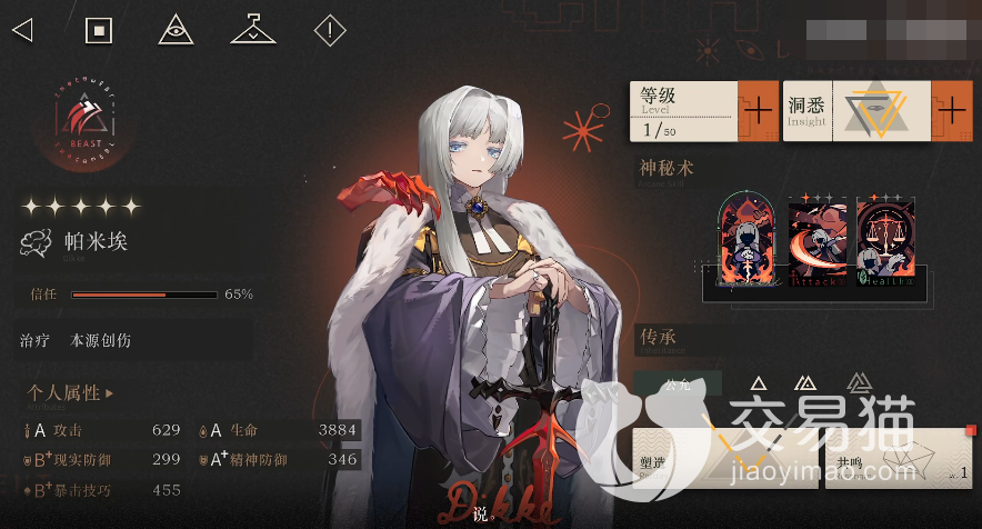 ⑤帕米埃:这位在五星中可以说是战神一般的存在,虽然技能普遍伤害范围只有单体,但不管是普攻还是大招都具备附加本源创伤的能力,这一能力可以直接百分百打出,敌人即使将双抗叠加的再高也都无济于事。另外她本身的承伤能力也还算不错,属性上双抗和血量都达到了B+以上的水准,此外,也无需担心她受不了持续伤害的侵袭,因为她的二技能可以提供群体治疗,针对半血以下目标还有额外治疗量的提升,因此续航能力可以说非常强悍。