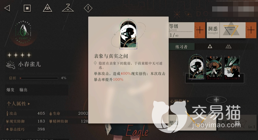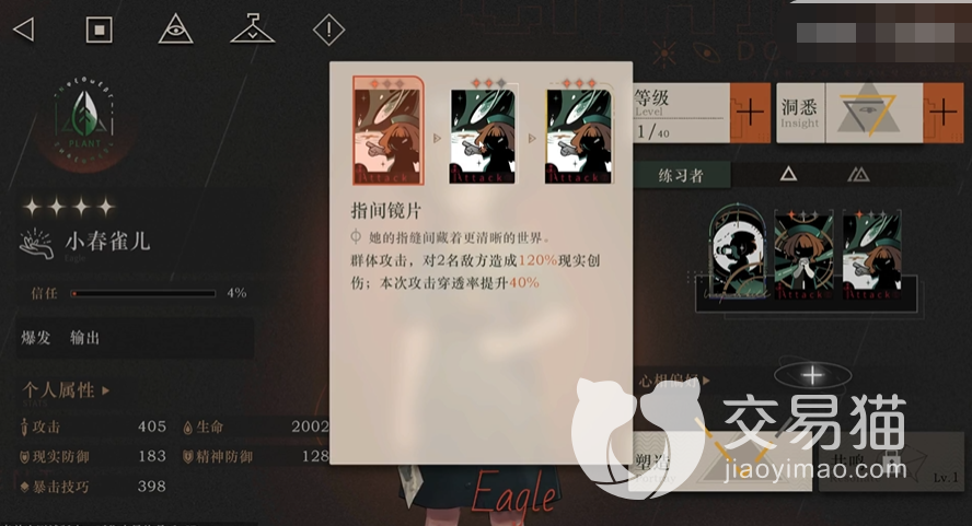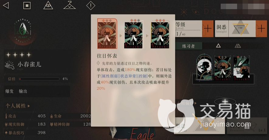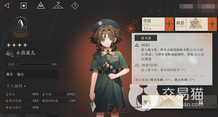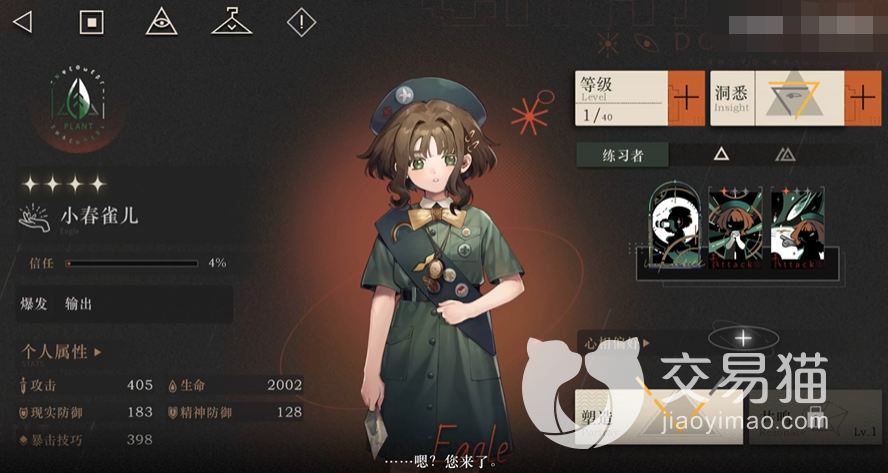 属性:小春雀最高的两项是攻击和暴击技巧,虽然比不了六星中那些顶尖的输出,但已经达到了一流的水准,而且属性本身是要结合技能和定位才能发挥最大优势的,恰好她本身的定位也十分契合这种属性分布,可以看到她的标签只有两个,一个是爆发,另一个就是输出,另外也无需担心其身板过脆而导致被秒,其生命值和现实防御还是不错的,精神防御确实低了点,但也可以通过配置对应的辅助角色来对此问题进行缓解。