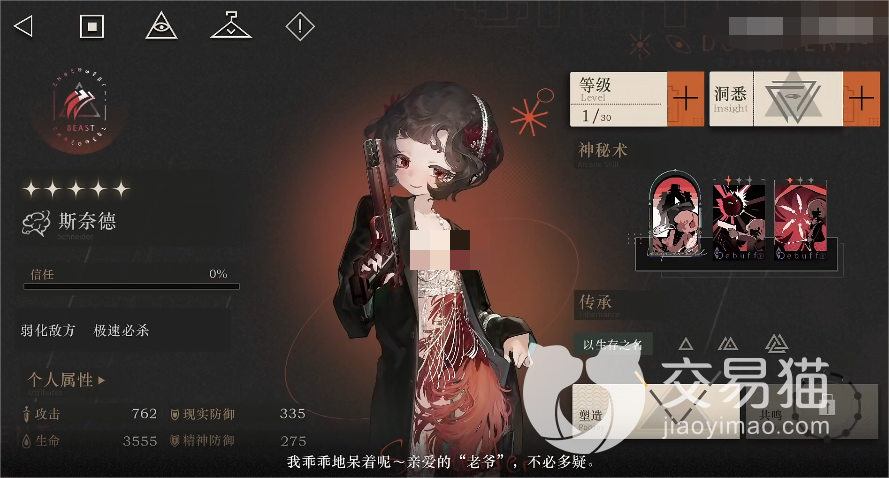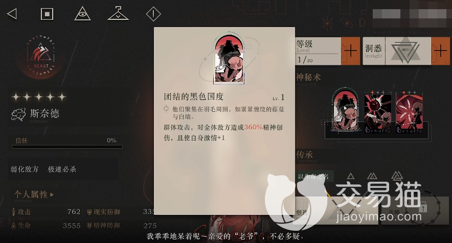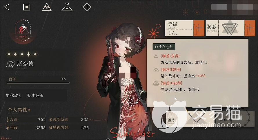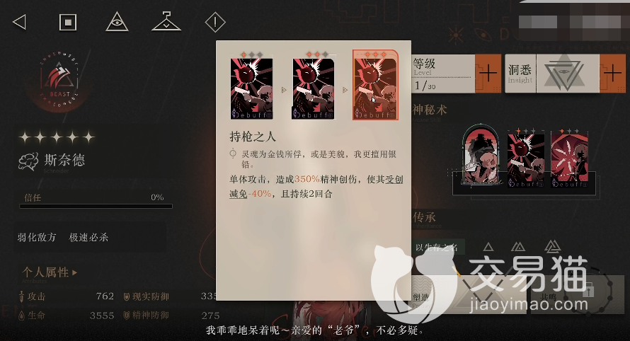 技能:她的两个小技能都是打伤害用的,首先是“持枪之人”,满星时可造成350%精神创伤,之后还会令敌人的受创减免降低40%,这个受创减免影响的是敌人的坦度,在降低之后己方的伤害打在目标的身上会变得更痛,而且该技能持续时间长达两回合,后续己方其他的减益角色还能够进一步在这方面对目标敌人进行削弱,从而打出更高的伤害。