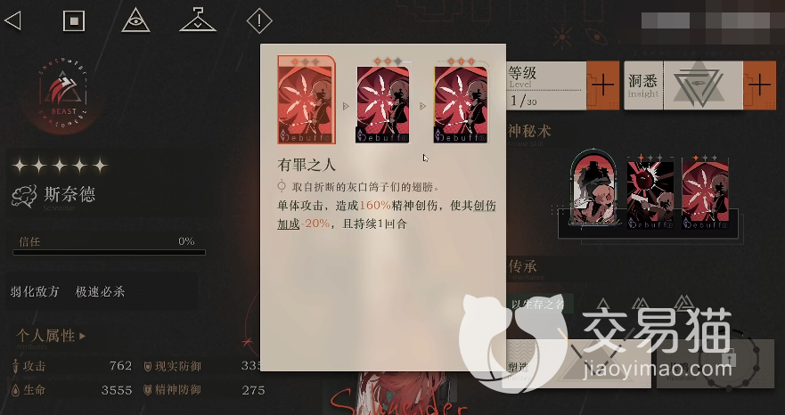 然后“有罪之人”同样是单体伤害技能,使用后会造成160%的单体伤害,之后还会降低敌人20%的创伤加成,这一削弱影响的是进攻端,它能够让目标敌人的伤害被严重削减,而且如果升满星后这个降低的幅度将提升到40%,另外持续时间也是长达两回合的,因此该技能给予了斯奈德应对高伤害敌人时的能力,另外这两个技能都是属于debuff技能,所以并不会受到“缴械”的影响。