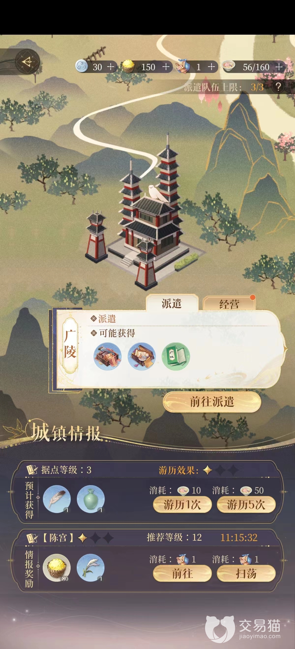 并且游戏在不同的据点也有着不同的派遣物,玩家在东阳这一据点可能会得到风火属性密探的好感材料包,盐和粮草等,而在广陵这一据点获得的便是随机的据点材料,任意属性密探的初级材料包和能与黑市商人进行交易物品的据点专属情报。截止到目前,玩家如果把任务全做完的话可以开满六个据点,还有五个据点需要玩家在游戏后期才可以解锁。而在据点重建时,玩家们需要收集对应据点的地图碎片,跟随攻略走正确的路才可以收集到百分百,成功把据点重建。