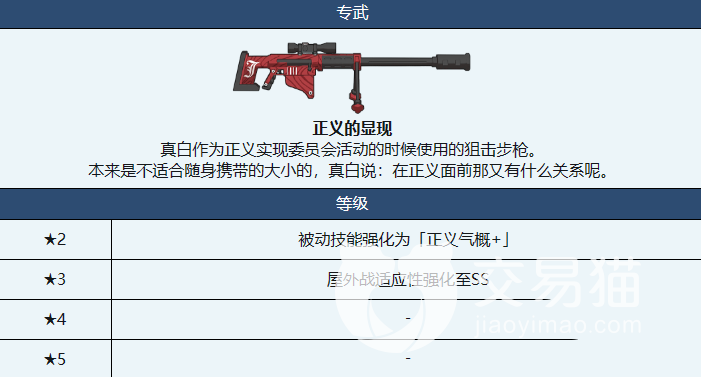 此角色的定位是瞬间爆发,其拥有很强大的专属武器,就是正义的显现,这是一款狙击步枪,虽然外形大小不适合携带,但很适合在室外作战的时候使用,可以强化被动技能。而且将武器升级到三颗星以后,能够使角色室外战斗的适应能力增强,进而提高室外作战的成功率,使游戏的体验感更强。