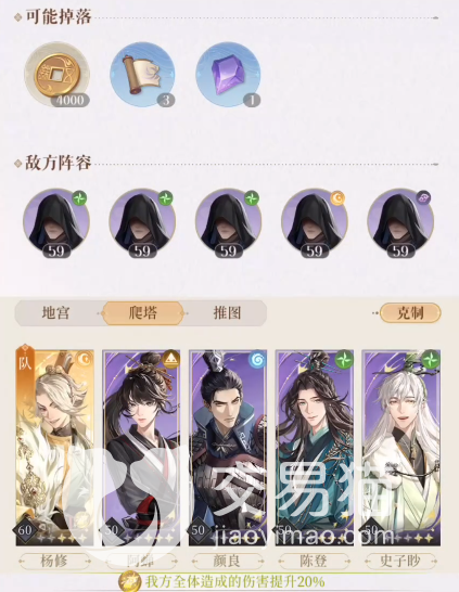 等级建议全体成员50级以上,杨修作为队长主输出等级最好达到60级更稳,而且需要大招减CD的命盘,如果玩家没有洗出来,那就选择用陈登作为队长。