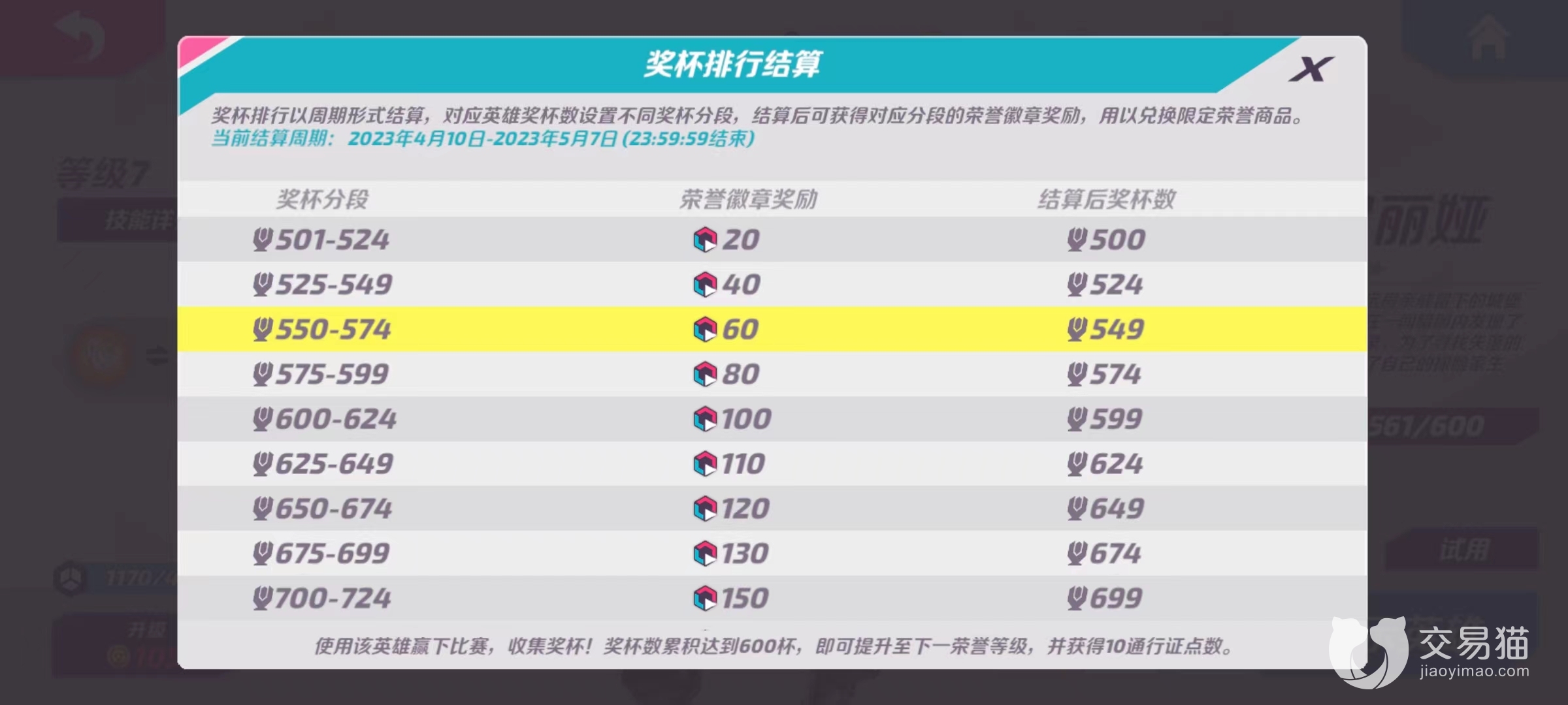 荣誉徽章现阶段有两个主要的获取方式:一个是每个英雄达到固定的杯段会直接奖励一部分荣誉徽章。另一个途径是通过一个结算周期后系统会根据超过500杯英雄的杯数自动结算一次,结算后杯数降低但获得一定的荣誉徽章。具体结算方式如下图。