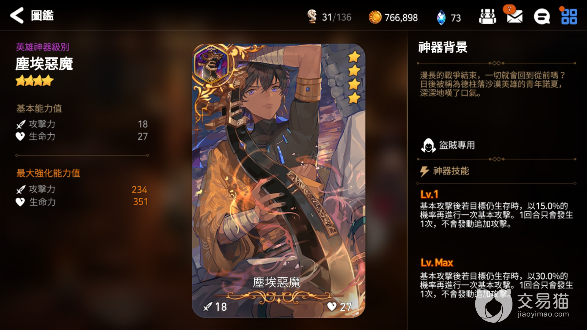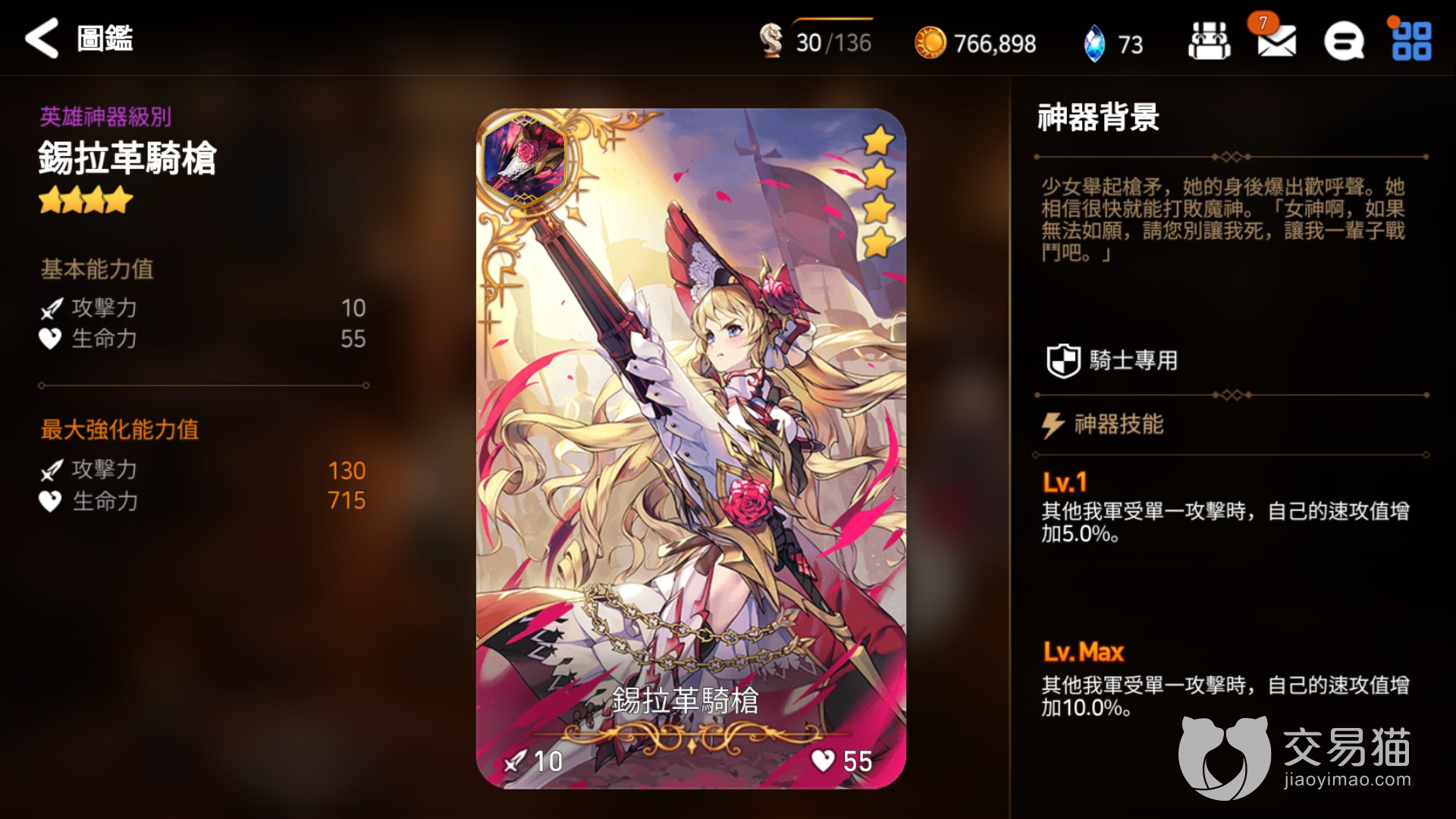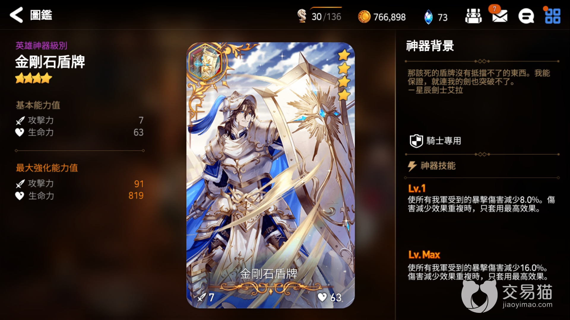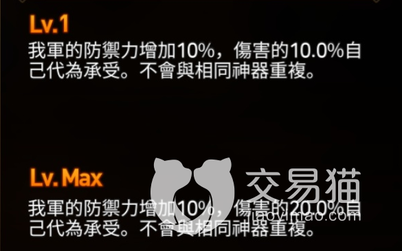 1、亚乌利斯:这个是骑士的四星神器,在达到满级之后效果为我方全部单位的防力增加10%,同时还能代替带有承受20%的伤害,该效果无法与其他相同类型的神器重。