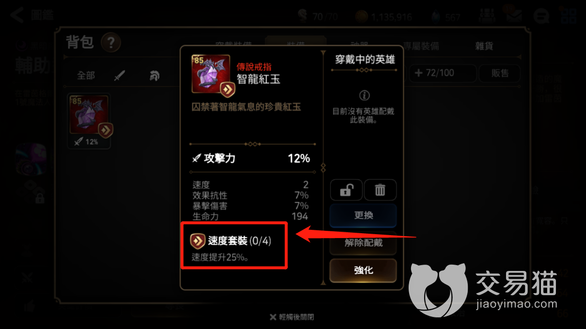 2、速度套:和其他的游戏一样速度套是游戏的核心,该游戏非常的看重速度之间的搭配关系。很多阵容都是依靠速度来进行调节的,不然就无法发挥出队伍的实力来。再有就是速度决定了出手的速度,因此大家日常也是需要做主注意收集这类套装的,任何情况下都是不嫌多的。对于一般的工具人辅助来说,基本都是无脑选择速度套配合上速度鞋子,速度才是取胜的关键。