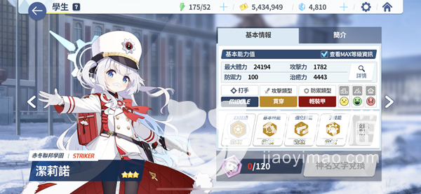 最后一个角色是洁莉诺(切里诺),这个角色的攻击属性是贯通,防御属性是轻装备。她的被动技能也是可以给自己增加攻击力属性,其EX技能可以对指定范围内的敌人造成超高额伤害,配合上被动技能十分给力。洁莉诺的普通技能可以每40秒就对敌方攻击力最高的角色进行集火,并且在攻击的同时降低其暴伤抵抗效果,更容易进行清剿。洁莉诺的辅助技能可以对Cost点数的回复提供加速效果,而且如果队伍中有另外的赤冬联邦学园的角色,那么这个加速效果会更加显著,这也让洁莉诺成为了联邦流派的核心角色之一。