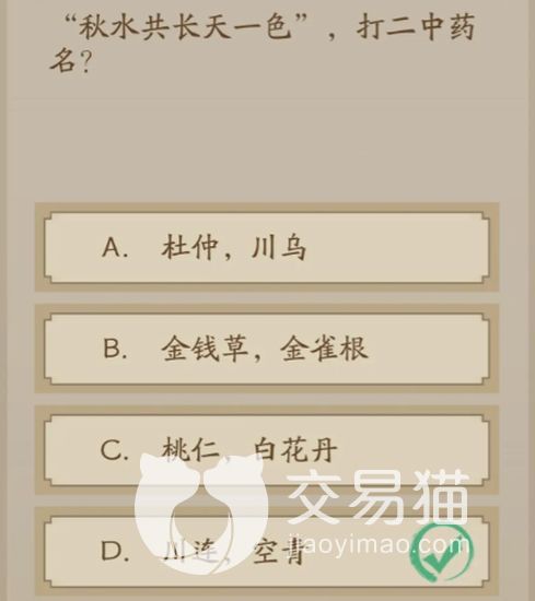 这个小游戏主要是一个猜谜语的游戏,会给大家一个题目,让大家猜中药名,就比如第一题“零落成泥碾作尘”,他的答案是沉香粉,第二题”正是湘妃泪尽时”,他的答案是竹立,第三题”佳木葱笼而可悦”,他的答案是清代,第四题“去年门巷,重筑新巢”,答案是燕窝和熟地,第四题“秋水共长天一色”,答案是川连和空青,第六题“明,车”,答案选择阴阳合,莲心。