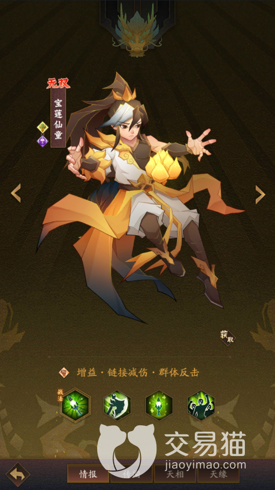 这套阵容除了青龙作为主C,最重要的就是仙童这个角色,需要飞升才能够获得,但是这款游戏里飞升的难度是非常大的,需要小伙伴们消耗大量的元宝才能够将仙童的练度提高上去,大招能够链接所有队友平摊伤害,并且自身的防御力也会大大提高,同时每回合还能够获得大量的治疗效果,是青龙队必备的辅助。