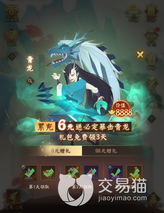 第二张青龙卡的获取方法也非常简单,首充6元就能够获得这个角色,这样小伙伴就能够将青龙的星级快速提升到4星,加强队伍的实力,也更方便小伙伴们通关主线,同时首充还能够获得一套金色的装备,给这个角色装备上刚刚好,而第三天登录的时候还能够获得9个仙族紫色伙伴,帮助小伙伴们将这个角色的强度更上一层楼。