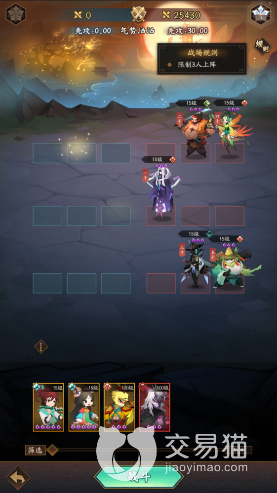 这个关卡里,对面一共有五个角色,而我方能够选择的角色只有四个,分别是15级的韩湘子和何仙姑,100级的孙悟空和九黎兵主,对面的先攻是30,这些是基本信息。