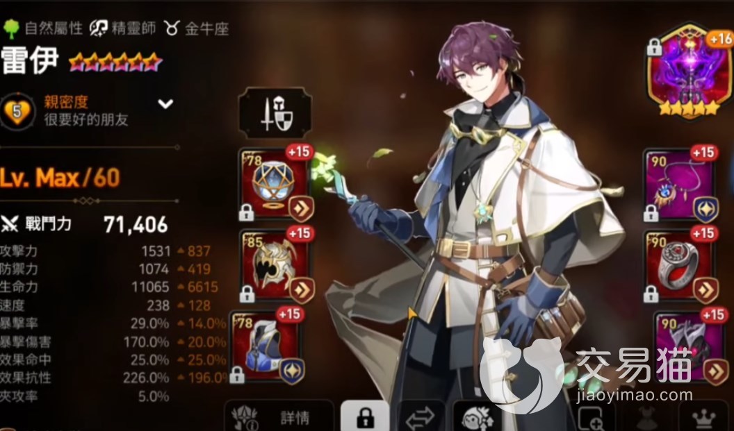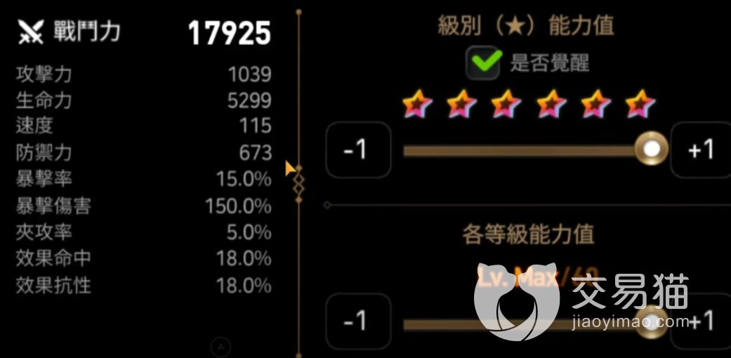 先看看水泰尼的角色属性,在满等级的情况下战力有17925,蛮高的,攻击力、生命不算高,速度不错,防御力很高,命中抵抗尚可。因为该角色的速度还是蛮快的,所以可以撑一速。