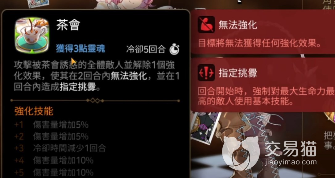 命中挑衅目标时候还会追击目标最大生命值百分比的伤害。大招能获得3点灵魂,CD5回合,攻击敌方全体并解除他们的1个强化效果,使其在2个回合内无法被强化,同时在1回合内有指定挑衅的效果,这里指定挑衅的作用就是让敌人攻击己方血量最高的单位,非常强力的负面效果。