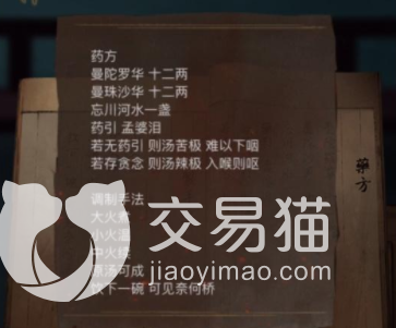 玩家想要通过奈何桥首先要进入亭子,在这里会给玩家一个不忘盏,首先要把这个放到背包中,其次就可以点击秤砣开始推演,推演的依据,需要看桌子旁边的书籍,在这个书籍上会给玩家药方,需要按照要求放入对应的数量,原始秤砣为二两,曼陀罗花是四两,那曼珠沙华应该为三两,玩家可以调换秤砣算出这些数据。