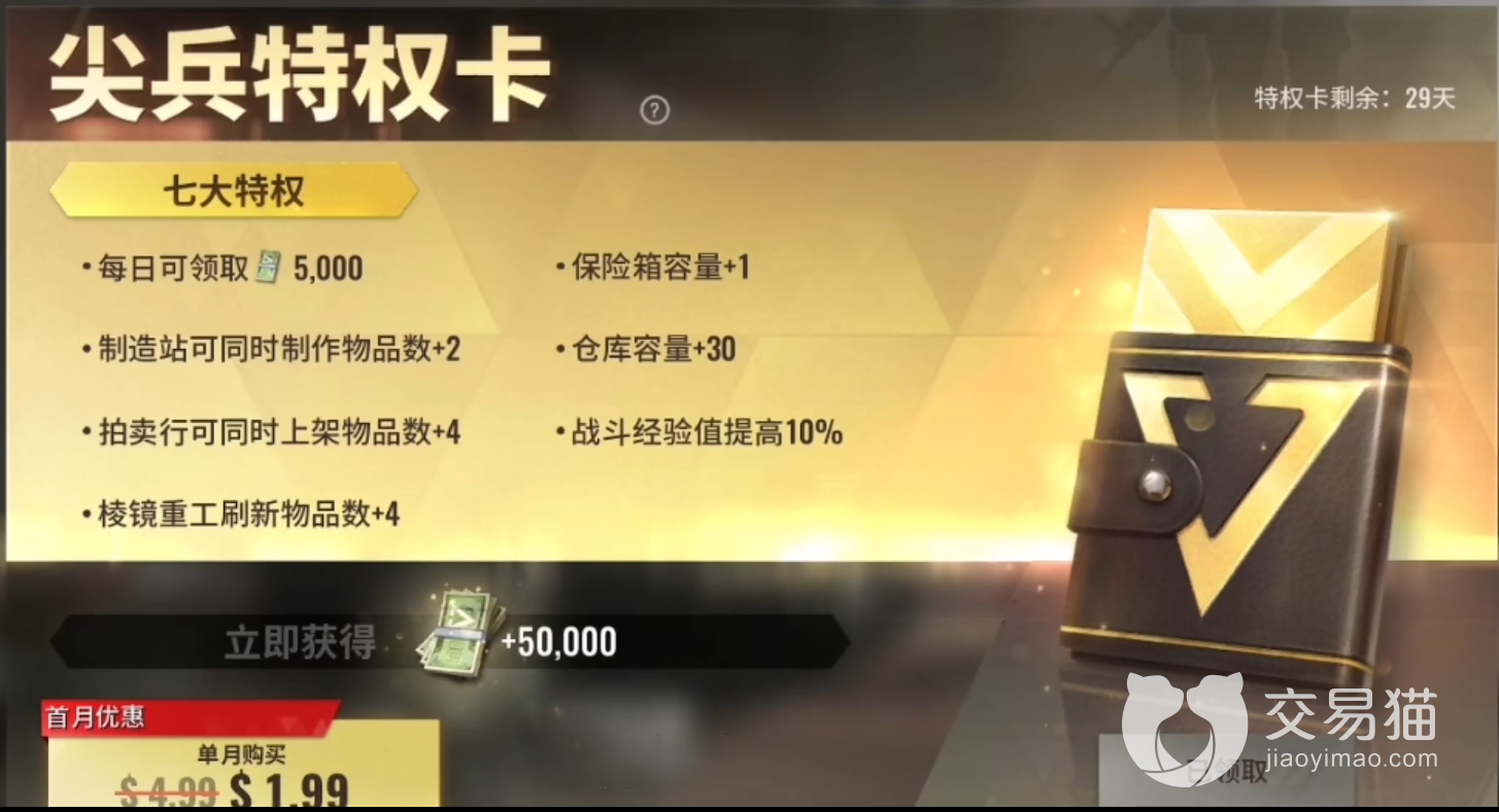 第二个保险箱的获得方式非常简单,打开商城,玩家需解锁特权卡则自动获取属于自己第二个保险箱,它的价格也是非常的便宜,拥有30天的使用权,特权卡附属的其他的六个特权也可提升玩家的游戏体验,每天都有钱可以领,对玩家的账号提升也是有一定的加速。