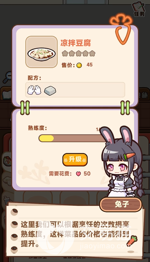 以上就是有关于兔子与餐厅攻略大全的全部内容了,在游戏内想要制作菜品除了需要食材之外还需要有相对应的厨具才行,在游戏内只需要使用小心心就可以进行兑换。