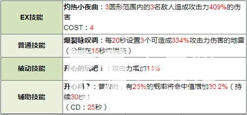 我们再来看看睦月的各项技能强度,首先我们可以看到她的EX技能可以用圆形的方式对三个圆形范围以内的3个敌人造成409%的伤害,并且圆圈叠加的地方伤害也是叠加的哦。加上普通技能爆裂咏叹调又可以设置带有伤害的地雷,每个地雷可以造成334%的伤害,被动技能又增加了14%的伤害,辅助技能也是提高攻击的命中率。一切的一切,都是为了提高睦月的伤害,这些技能伤害加成放在一起,睦月的伤害可以说是非常高了,绝对是平民小伙伴们的战斗扛把子。