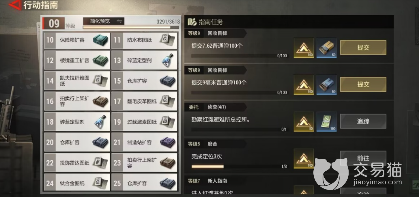 通过上面这些等级提升之后能够开启的功能来看,行动指南对于玩家来说非常的重要。指南任务包括让玩家提交9.62普通子弹100个,或者9毫米普通子弹100个。任务内容通常不难,玩家通过这些简单的任务就可以不断的获取到一定的经验,来完成升级。
