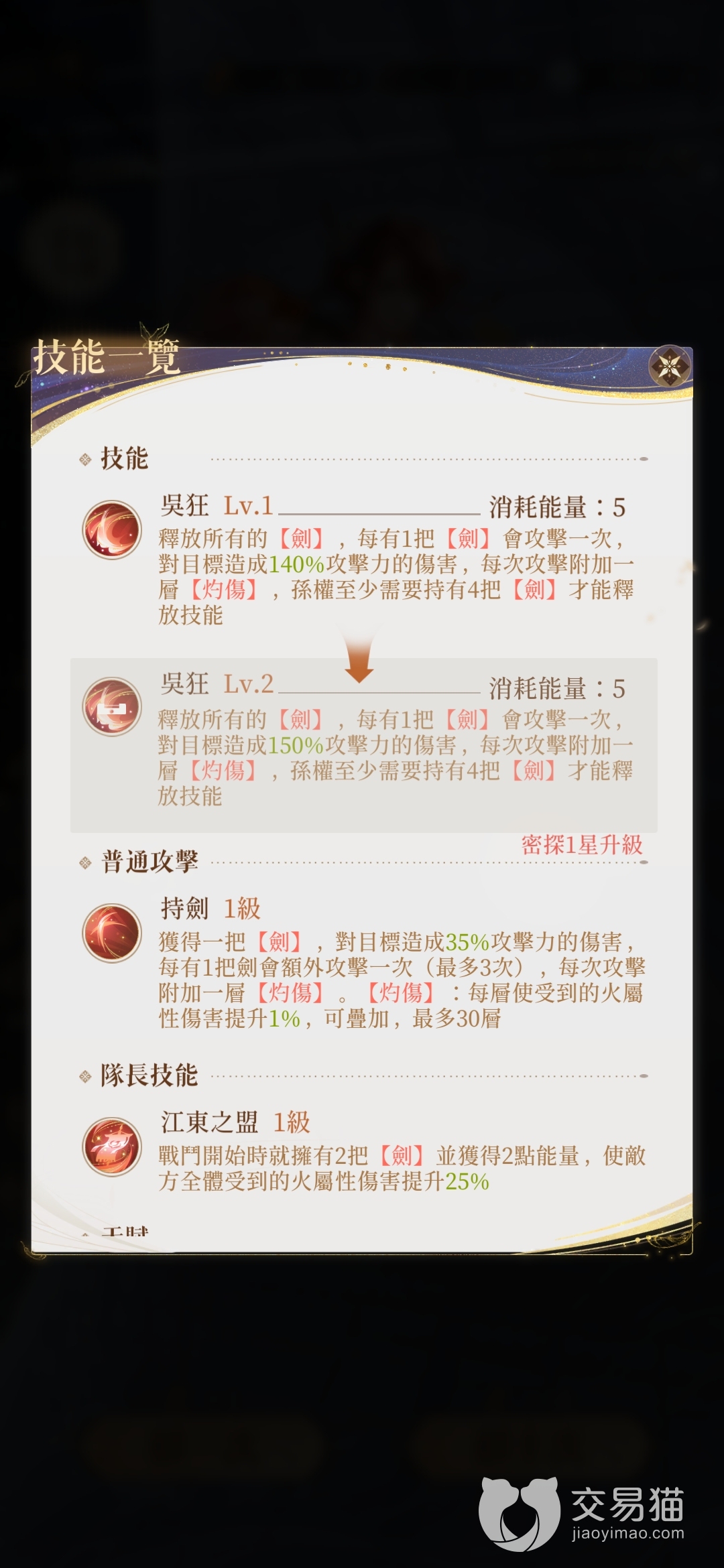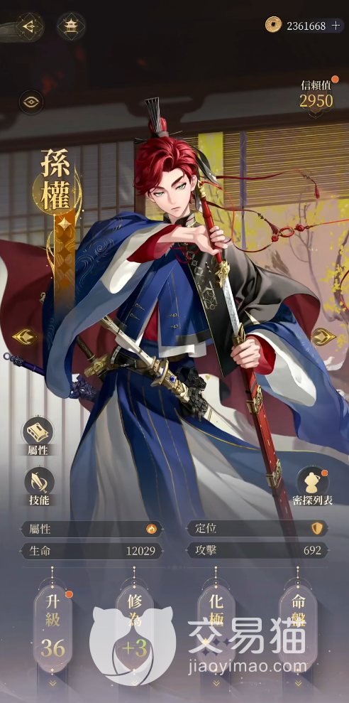 孙权:从面板来看,他的定位是一个肉盾,三十六级的情况下生命有一万二,攻击有六百九,前者放眼全游戏也是数一数二的水平,后者的话则虽然比不上主流输出,但作为一个防守型角色来说也算得上不错了。
