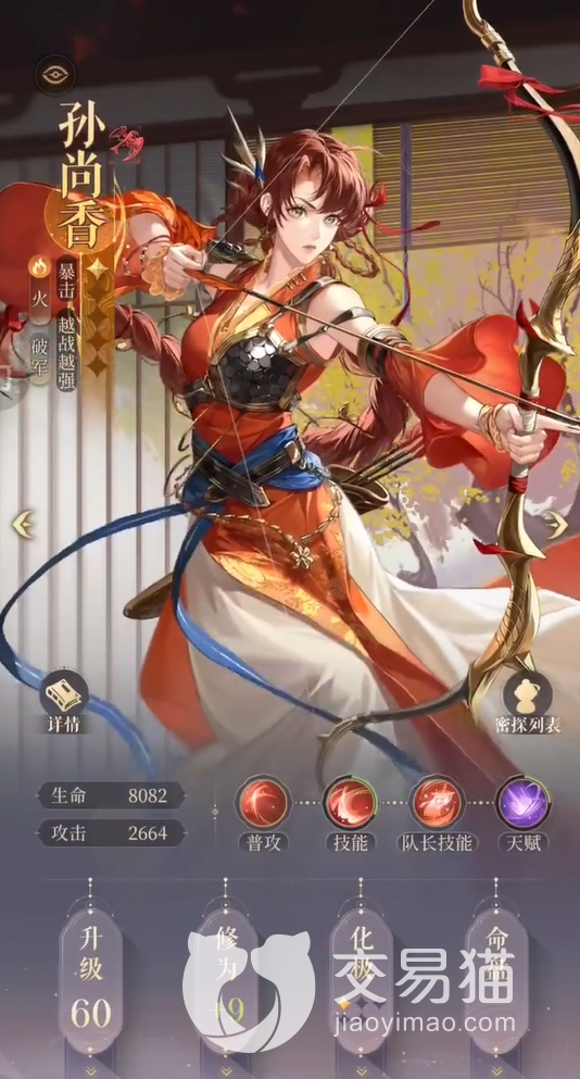 孙尚香:她的面板明显是一个输出型的面板,高达2664的攻击让它对比其他一众输出角色都不落下风,八千的生命虽然无法与主流肉盾所相提并论,但对比一些同为输出的角色还是绰绰有余的。
