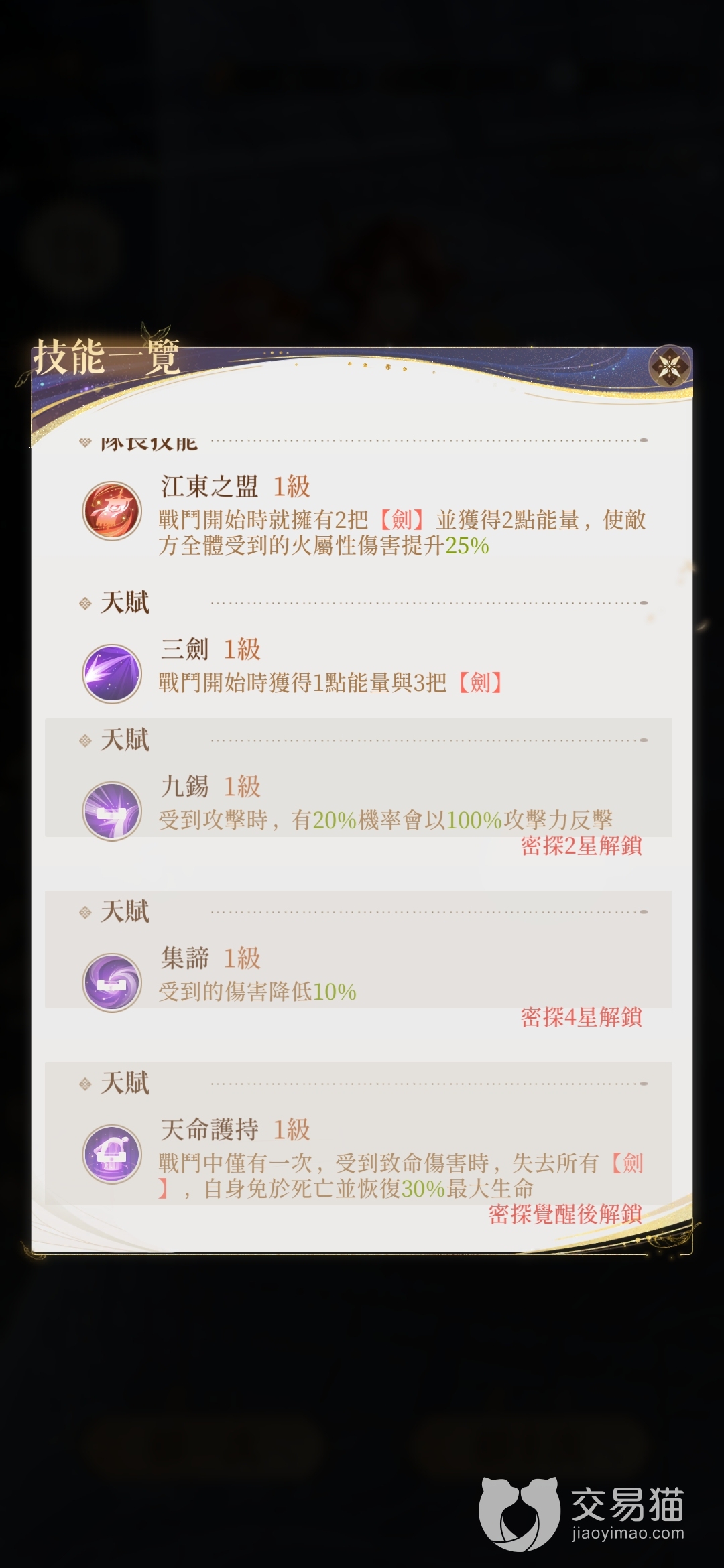 天赋方面孙权共有四个,分别是“开局获得1点能量3把剑”的“三剑”,“20%几率触发100%攻击力反击”的“九赐”,“提供10%减伤”的“集谛”,以及以失去所有剑为代价获得一次保命和30%生命回复的“天命加持”。