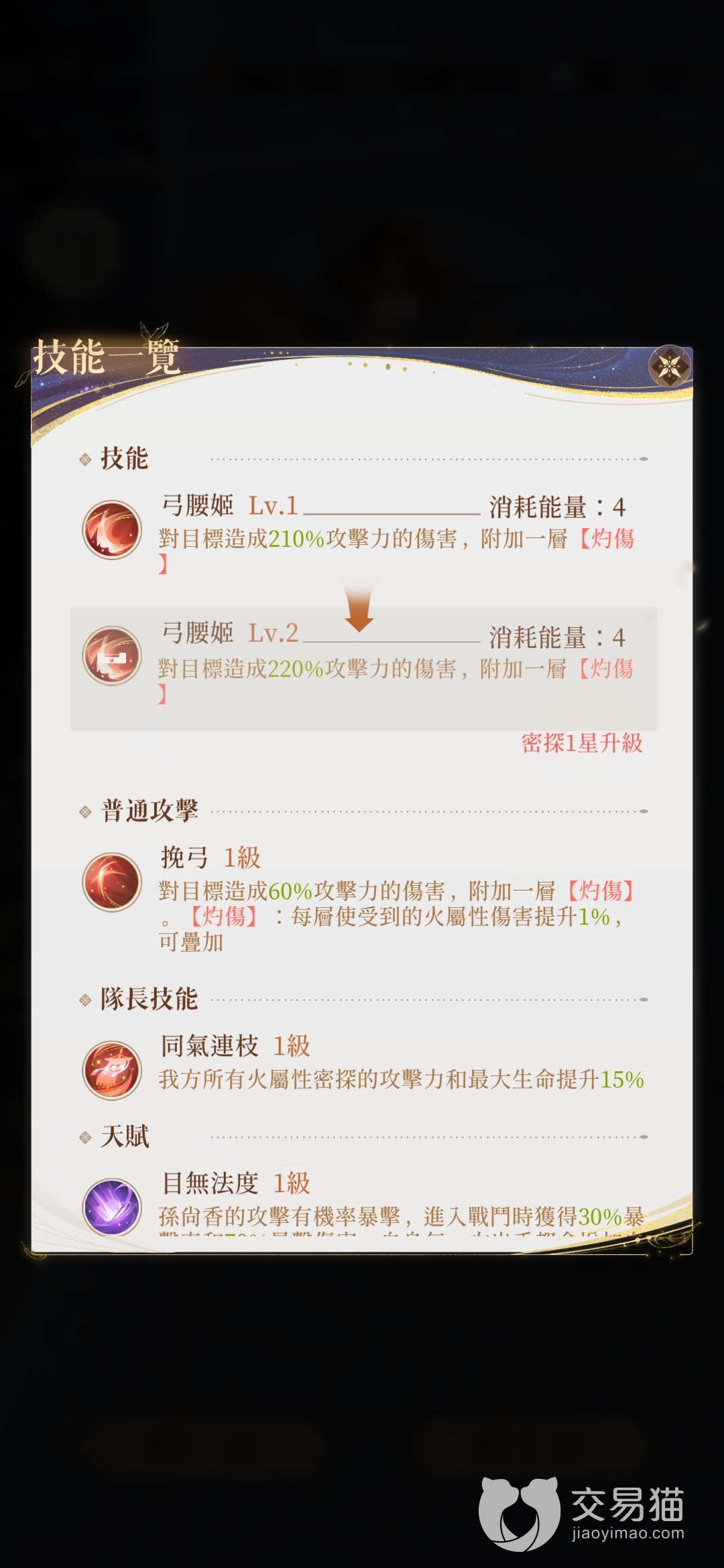 其普攻“挽弓”基础伤害只有60%,不过却可以对敌人附加一层灼烧以此提升后续的火系伤害,其技能也可以附加主搜爱好,不过伤害系数达到了更高的210%。