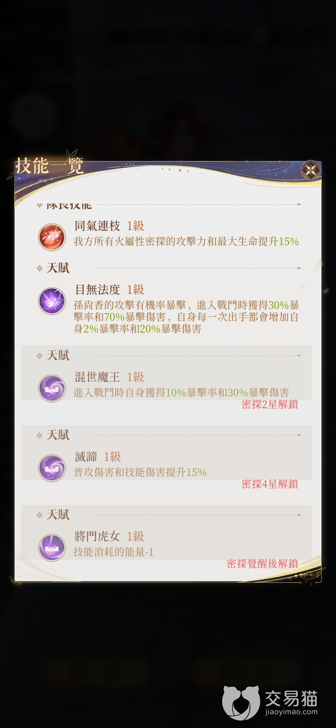 她的队长技能则可以令己方所有火属性密探的攻击和生命都提升15%,这个增幅可以让纯火系队伍很大幅度的提升战力,搭配阵容的时候思路也会更加清晰。